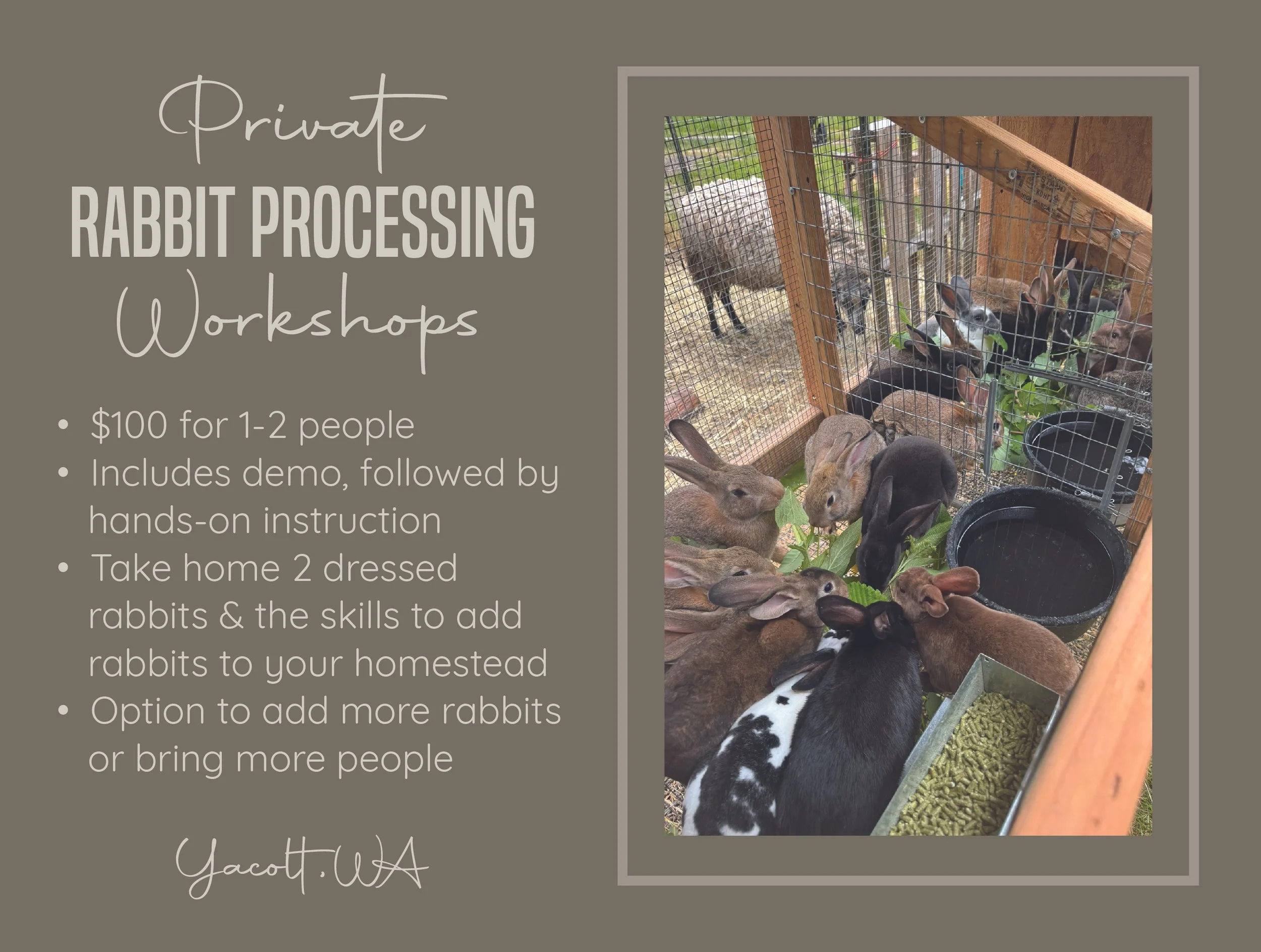 Come join us for a private, hands-on rabbit workshop where we’ll show you every step of taking a homegrown rabbit from your homestead to your freezer.